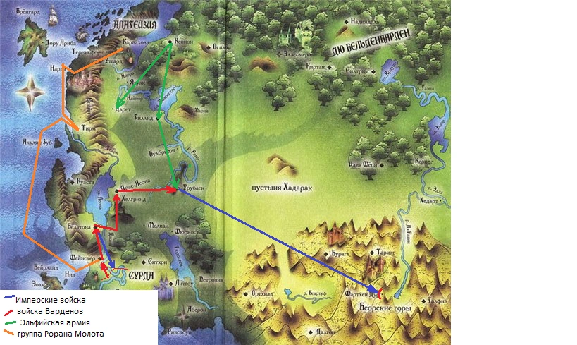 | « | А теперь мы пойдём на север, на Белатону, а когда возьмём и её, то двинемся дальше, к Драс-Леоне, завоюем её и двинемся на Урубаен, где либо свергнем Гальбаторикса, либо все погибнем. Насуада[3] |