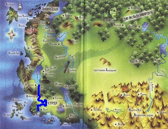 Река, которая течёт через территорию Сурды и Пылающих равнин. Впадает в озеро Леона. Неподалёку от реки находится город Фейнстер. В конце последней книги отдана Насуадой Сурде.