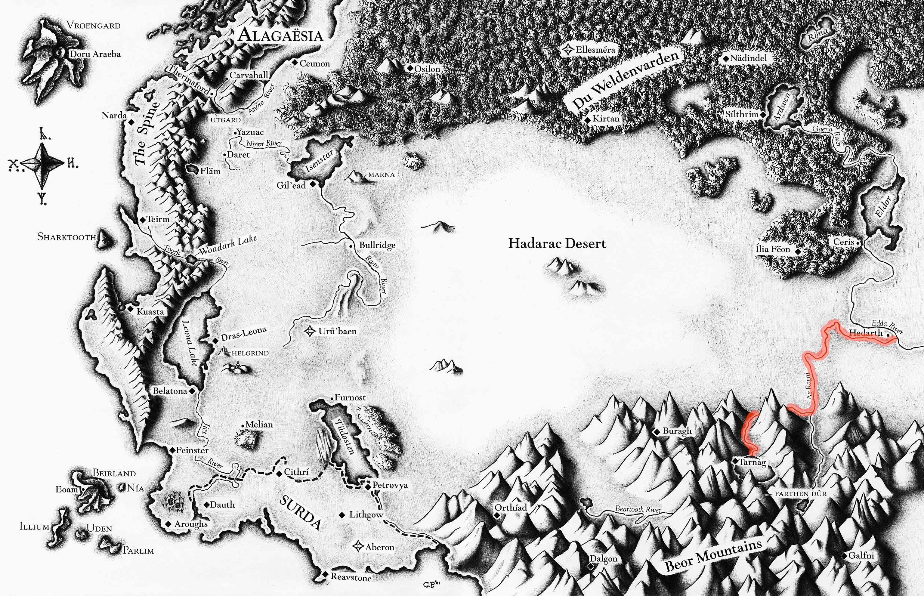The Az Ragni ("The River" in Dwarvish) was a river in the Beor mountains. It flowed out Tarnag's lake and out of the valley the city was in.[1] From there, it went along the northern edge of the Beors before merging with the Ragni Darmn at the end of the Odred Valley.[2] This doubled the river's size and speed to the point that the shores were eventually over a mile apart with an unstoppable current between them.[2] The Az Ragni then flowed north and then west and ended up at Hedarth where it connected with the Edda River.[3]