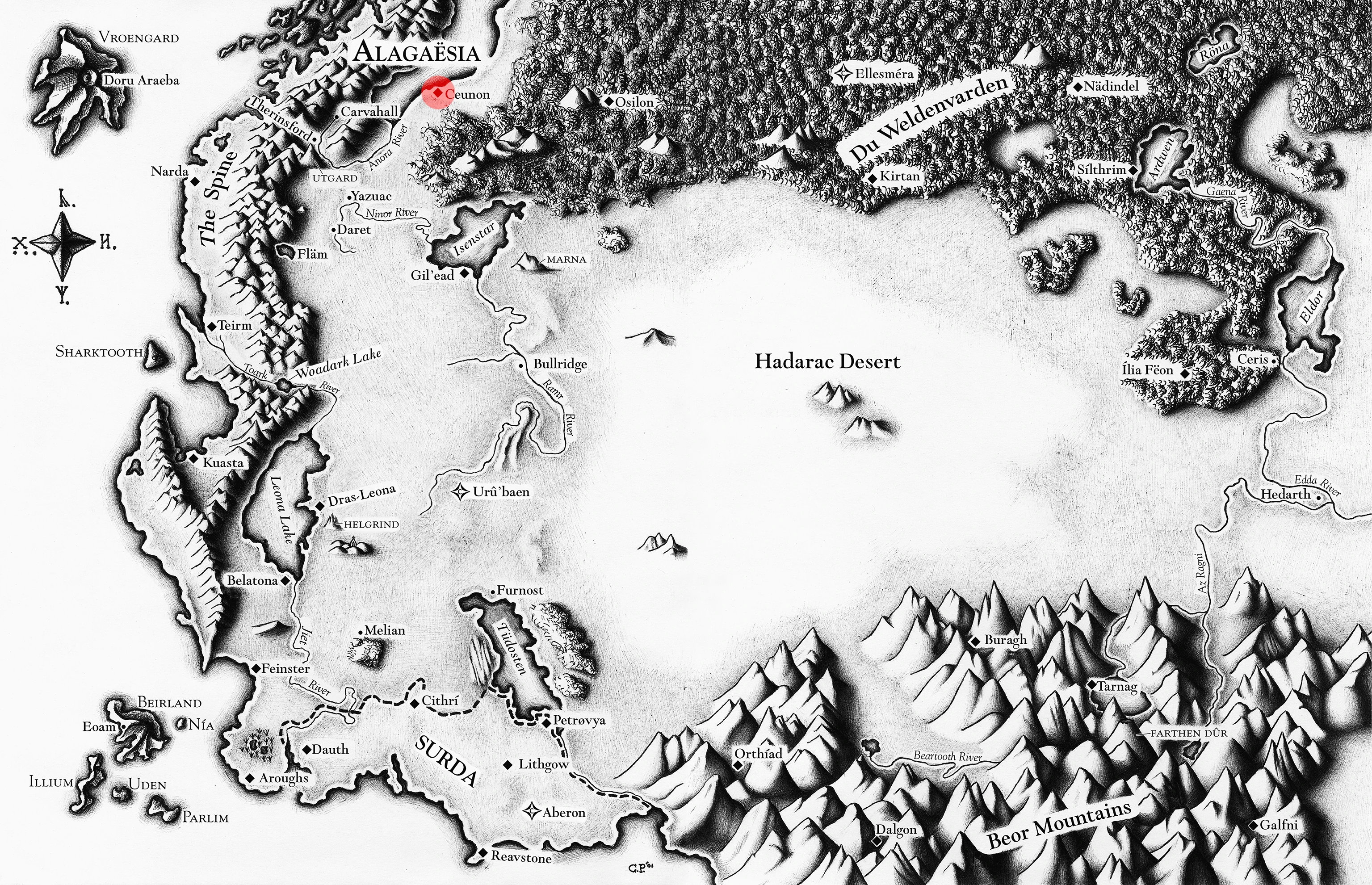 Ceunon was a city located in the north of Alagaësia, on the borders of the Du Weldenvarden forest and built along the North Sea. It was the northernmost city in the Broddring Empire and was likely the headquarters of the Traders. Also, it was where Horst finished the final year of his apprenticeship as a smith under Kelton.