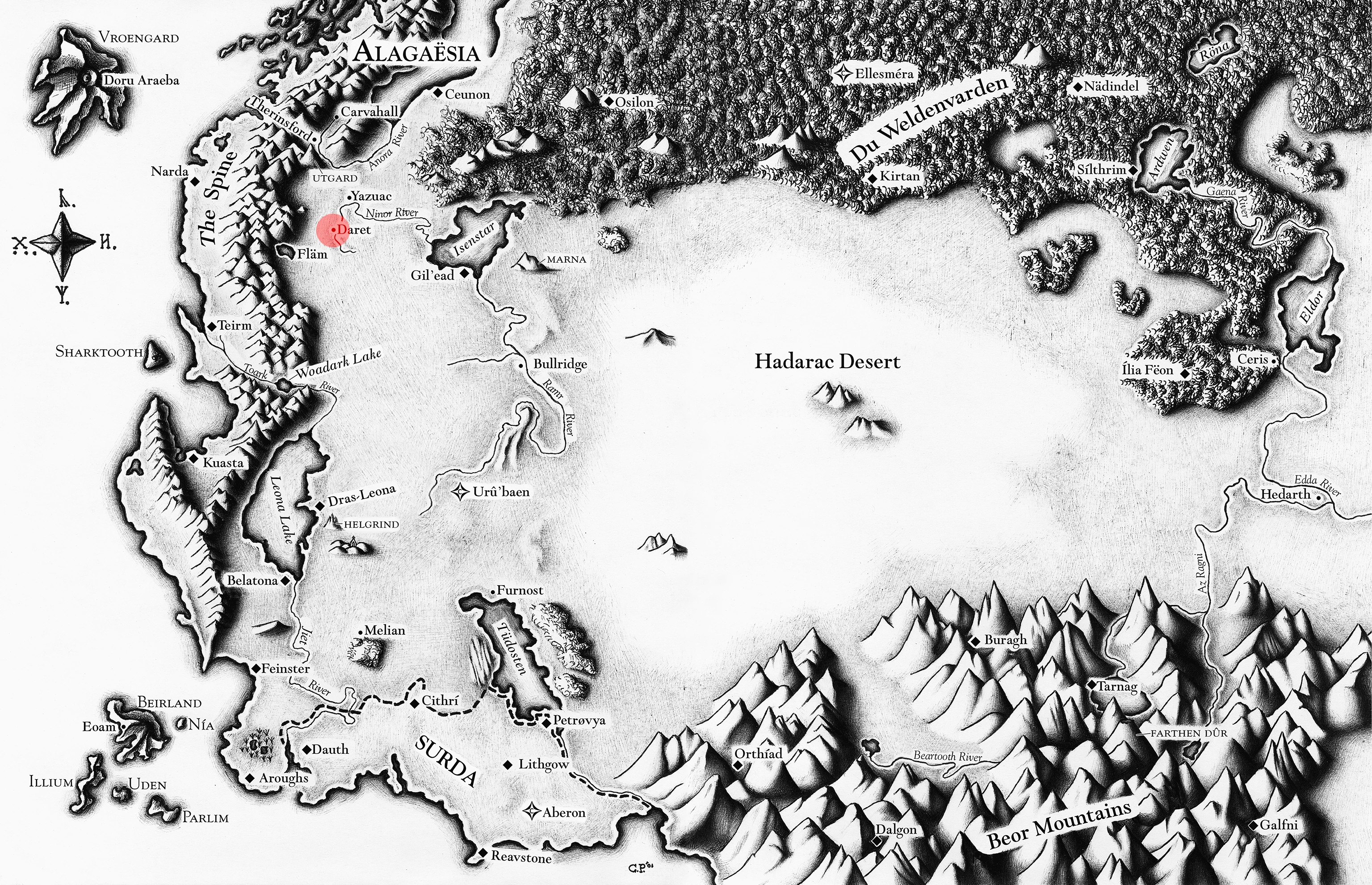 Eragon and Brom passed through here while hunting the Ra'zac and were almost ambushed here. It was also in Daret that Brom purchased a glove for Eragon to hide his gedwëy ignasia.