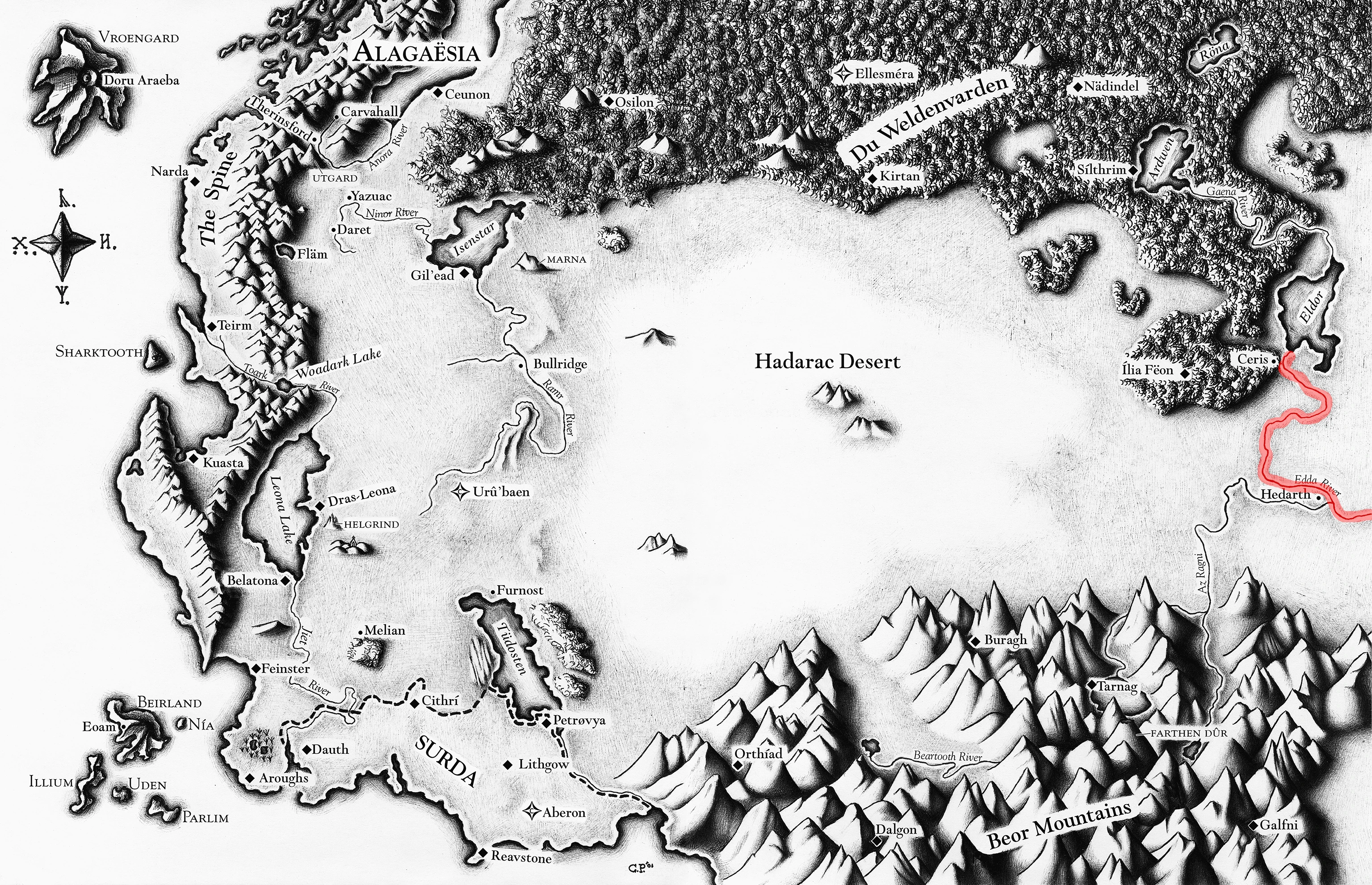 The Edda River, the farthest eastern river in Alagaësia, was a river that stemmed from the Eldor Lake and lead to Ceris. It then continued east to where Âz Ragni flowed into it. Orik, Arya, Eragon and Saphira traveled up the river to reach Ceris. Then the group traveled on the Gaena River. It eventually wends beyond the Beors and into the Eastern Reaches wending past Dragon Riders Academy located next to Mount Argnor and onewards. It also acts as a trading ground between the Dwarves, Nomads of the land, Wandering Tribes and Dragon Riders, the Dwarves transporting goods by the Edda River.