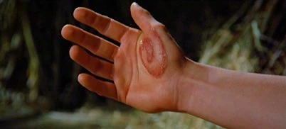 It appeared as a silver diffused spiral oval marking on a Rider's palm, and would first appear after a Rider first touched their dragon. It forms with a flash of light and, as Eragon described it, a sensation as though ice cold water that tingled and snapped through the Rider.