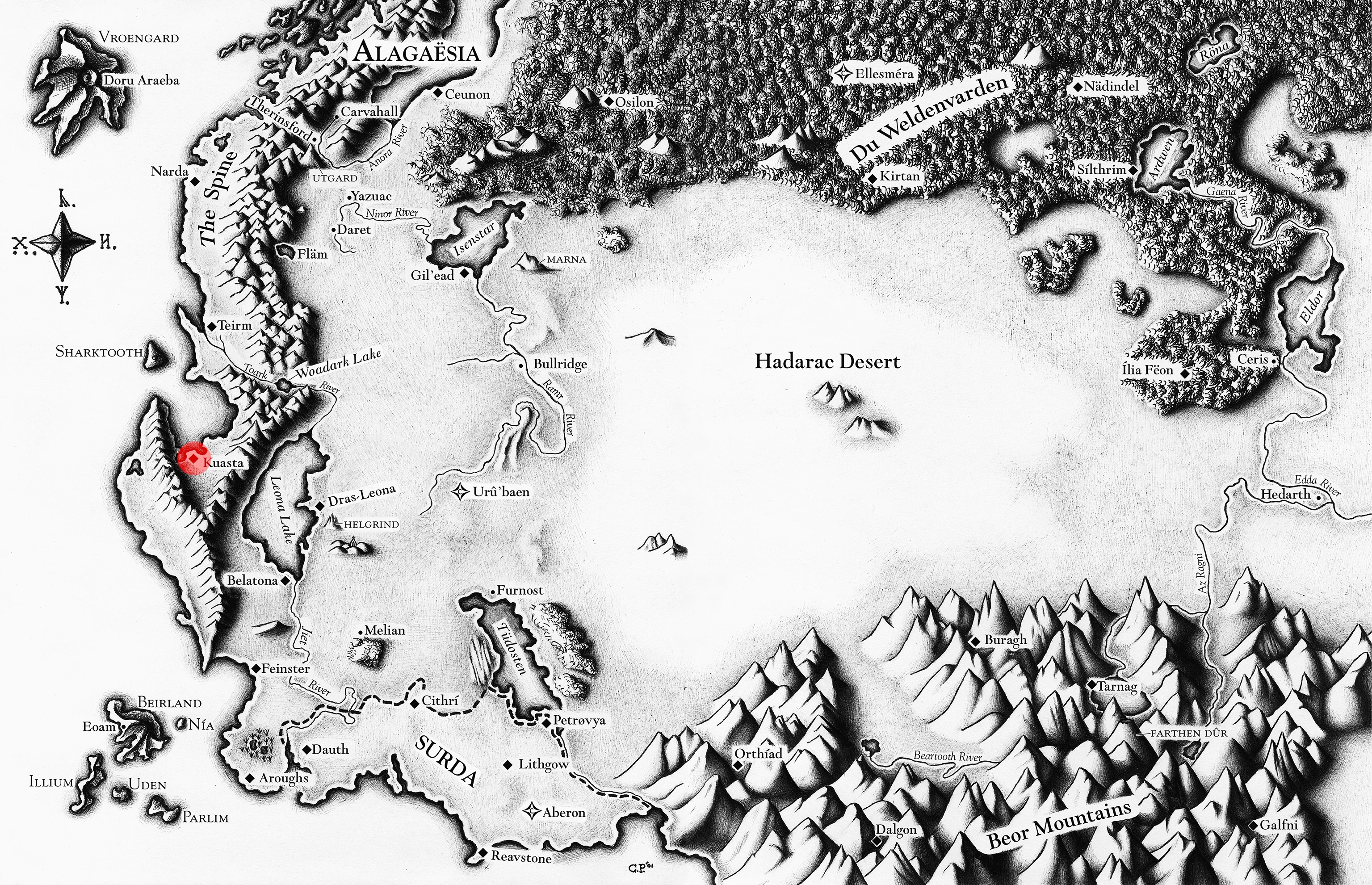 Kuasta was a city located within the mountains the Spine and on the coast south of Teirm. It was the birthplace of Brom.
