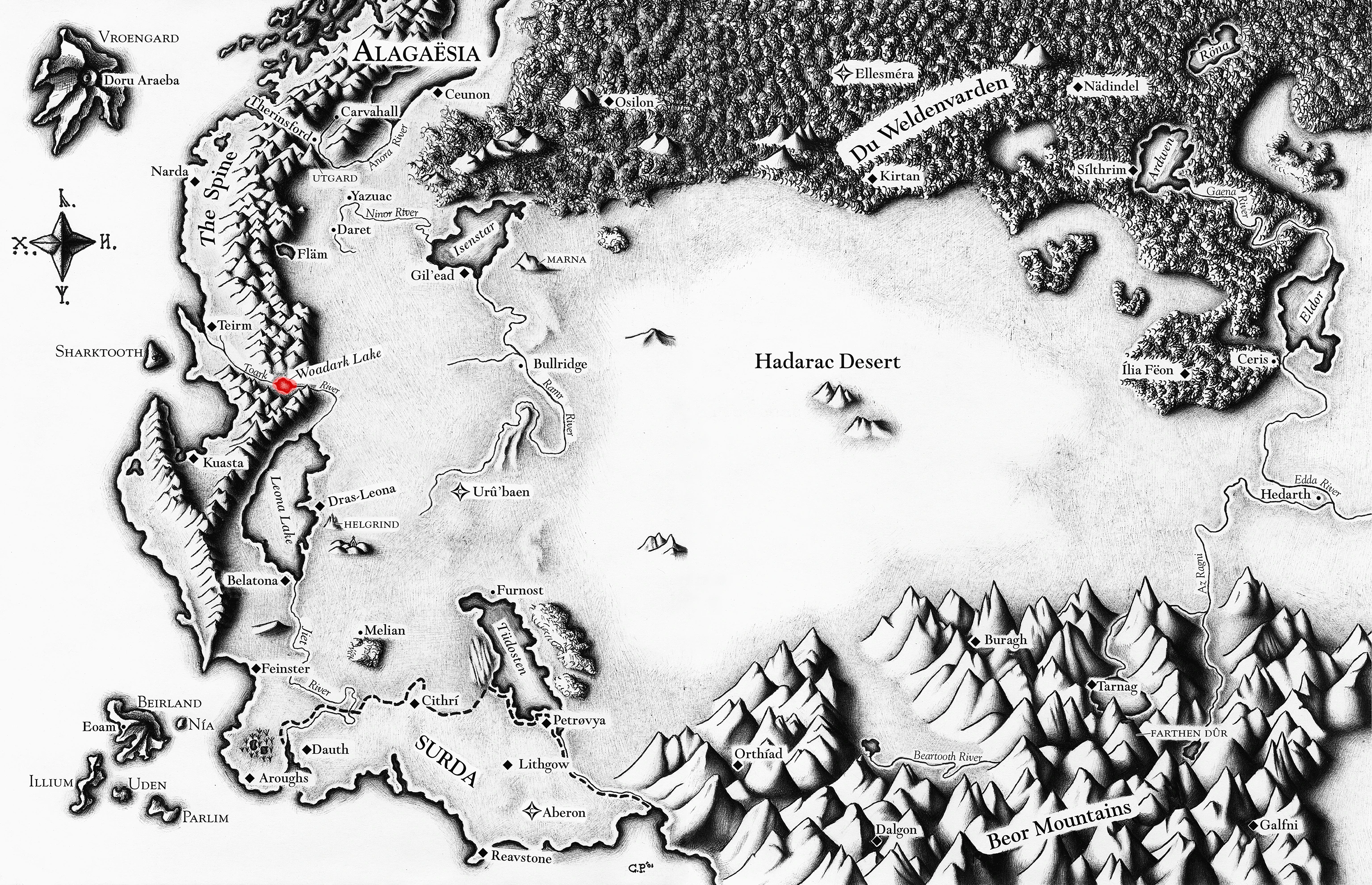 Woadark Lake was a lake in Alagaësia, nestled within The Spine. The Toark River flowed from it in both directions, east and west.